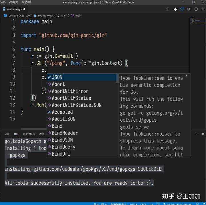 最重要的是检查两个东西是否安装:1、VSCode的Go扩展,2、检查几个相关的package是否安装(gocode, gopkgs, godef, go-outline)。