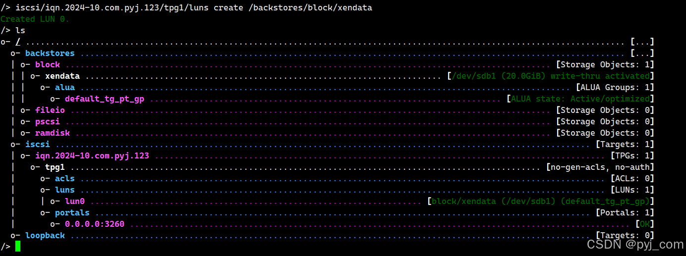 iscsi/iqn...../tpg1/luns create /backstores/block/xendata