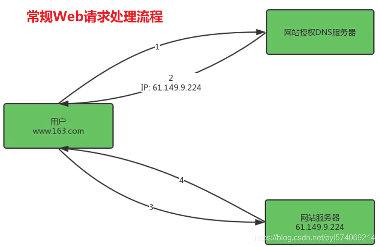 1、当用户点击网站页面的内容URL,经过本地DNS系统解析,DNS系统会最终将域名的解析权交给CNAME指向的CDN专用DNS服务器