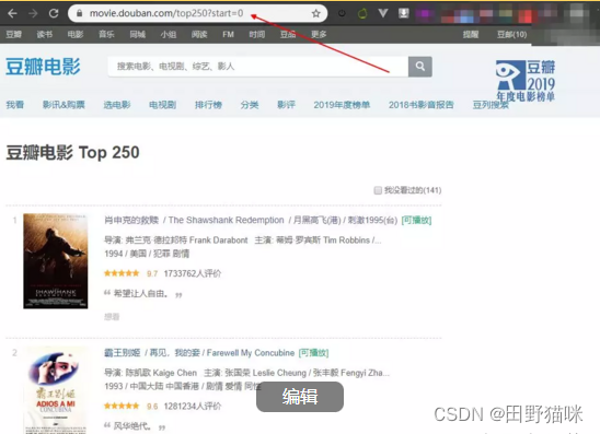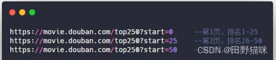 爬虫的第一步,分析url,经过分析,豆瓣电影Top250页面的url有一定的规则: