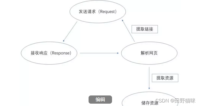 如上图所示,爬虫的第一个步骤就是对所要爬取的网页进行请求,以获取其相应返回的结果,然后在使用一些方法,对响应内容解析,提取想要的内容资源,最后,将提取出来的资源保存起来。