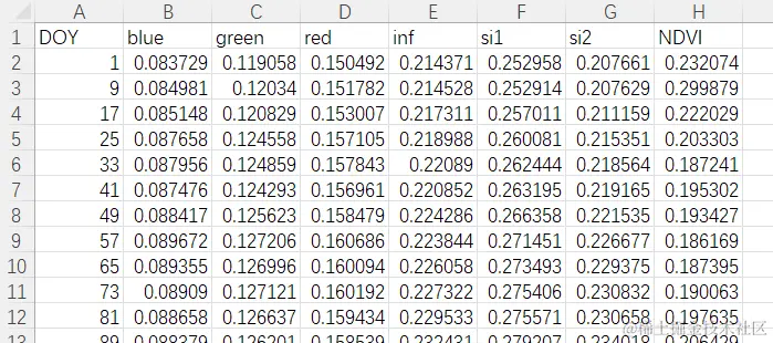 我们现在的需求是,希望对于每一个名称为Ref_GRA_Y.csv格式的.csv文件,求取其中每一个单元格在所有文件中数据的平均值。例如,对于上图中DOY为1的blue这个单元格,那么求出来的平均值就是在全部名称为Ref_GRA_Y.csv格式的.csv文件之中,DOY为1且列名为blue的单元格的平均值。此外,如果像上图一样,出现了部分单元格数值为0的情况,表明在当前文件夹下,这个单元格是没有数据的,因此需要在计算的时候舍去(并且取平均值时候的分母也要减小1)。