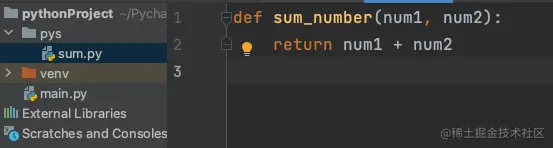 在实际项目开发中会有大量的函数,为了便于管理,我们通常会将函数放在单独的模块中我们也可以说放在单独的文件中,比如我们新建pys文件夹,在文件夹下创建sum.py文件,将上述定义的sum函数写在这个文件中,然后需要在main.py中调用这个方法,当前目录结构为