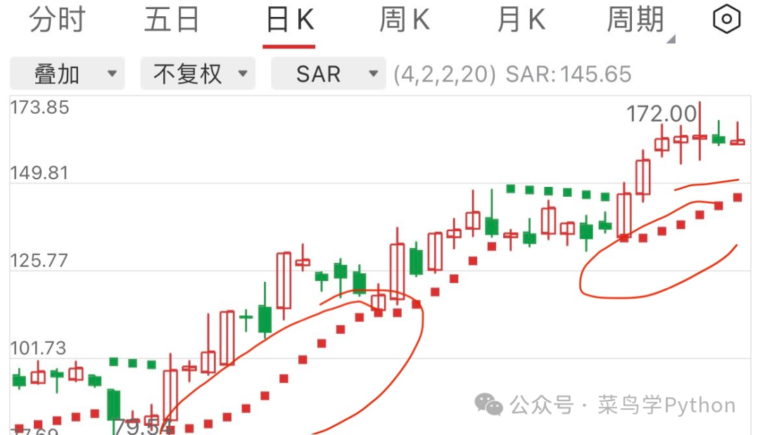 是不是非常神奇。我们先看一下这个指标长什么样子,比如我们随便一个股票软件的分析图,找到这个SAR指标,看看: