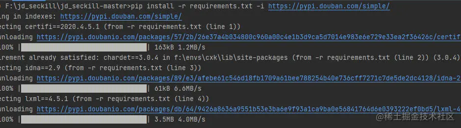 输入命令:pip install -r requirements.txt -i pypi.douban.com/simple/
