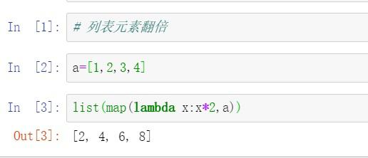 下例中,通过map函数与lambda函数,将列表的每个元素乘以2,短短一行代码,是不是有简洁?map函数会根据提供的函数对指定的序列做映射,返回迭代器,在利用list函数,返回列表。