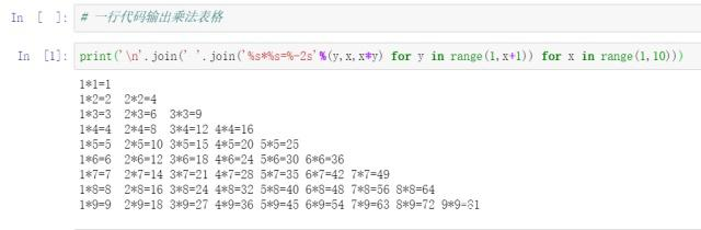 在代码框中输入:"print('\n'.join(' '.join('%s*%s=%-2s'%(y,x,x*y) for y in range(1,x+1)) for x in range(1,10)))"