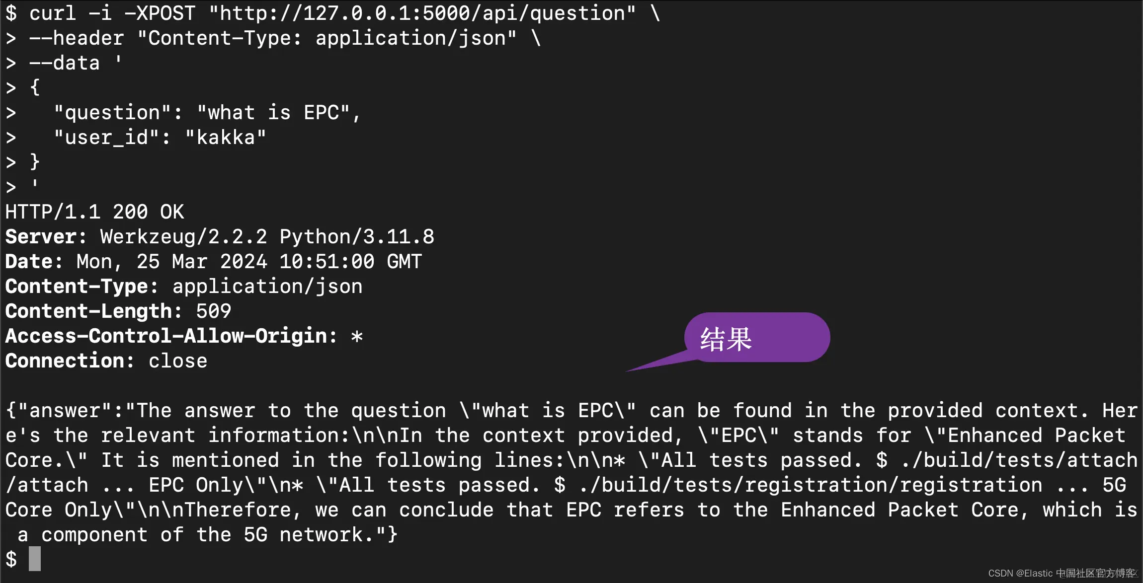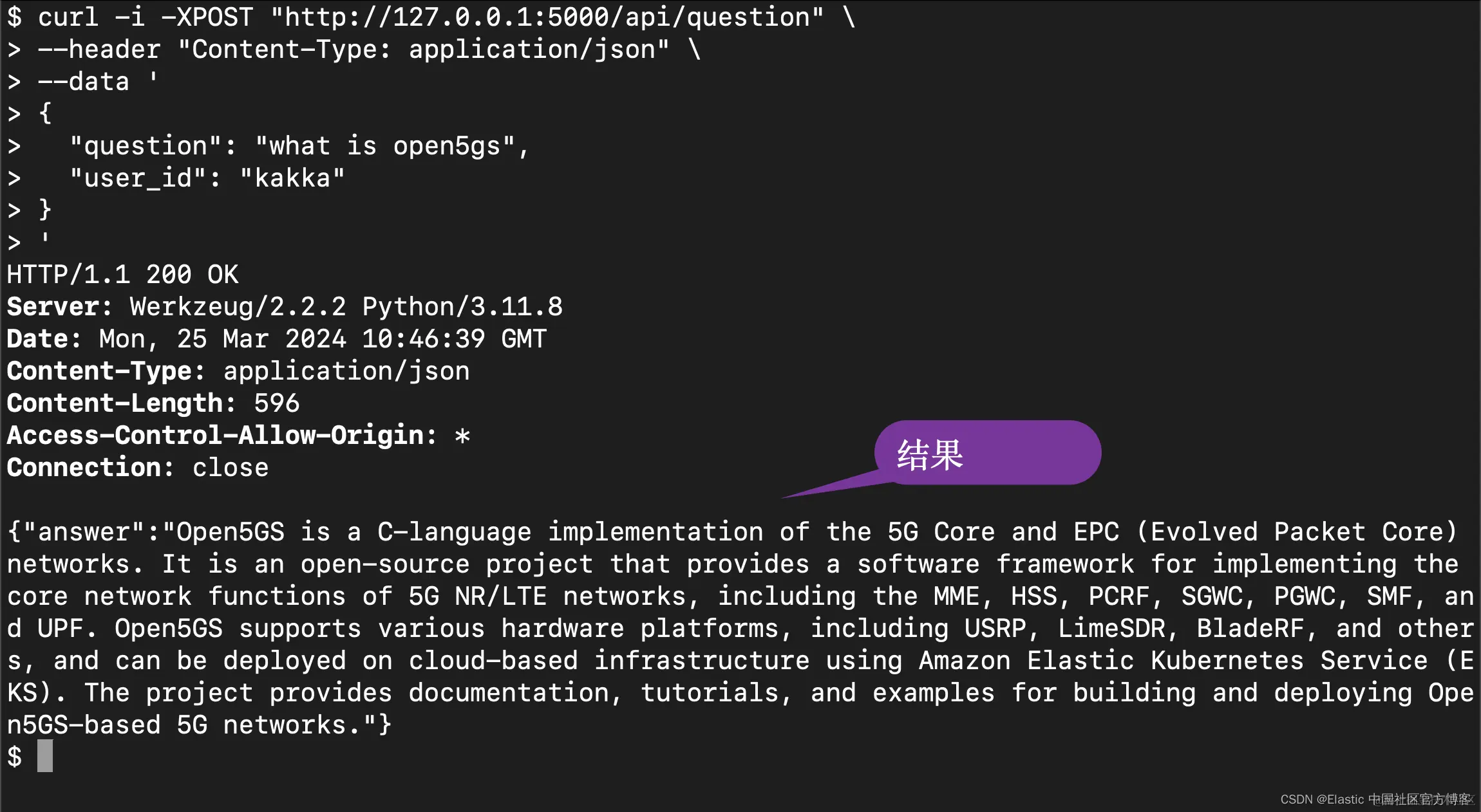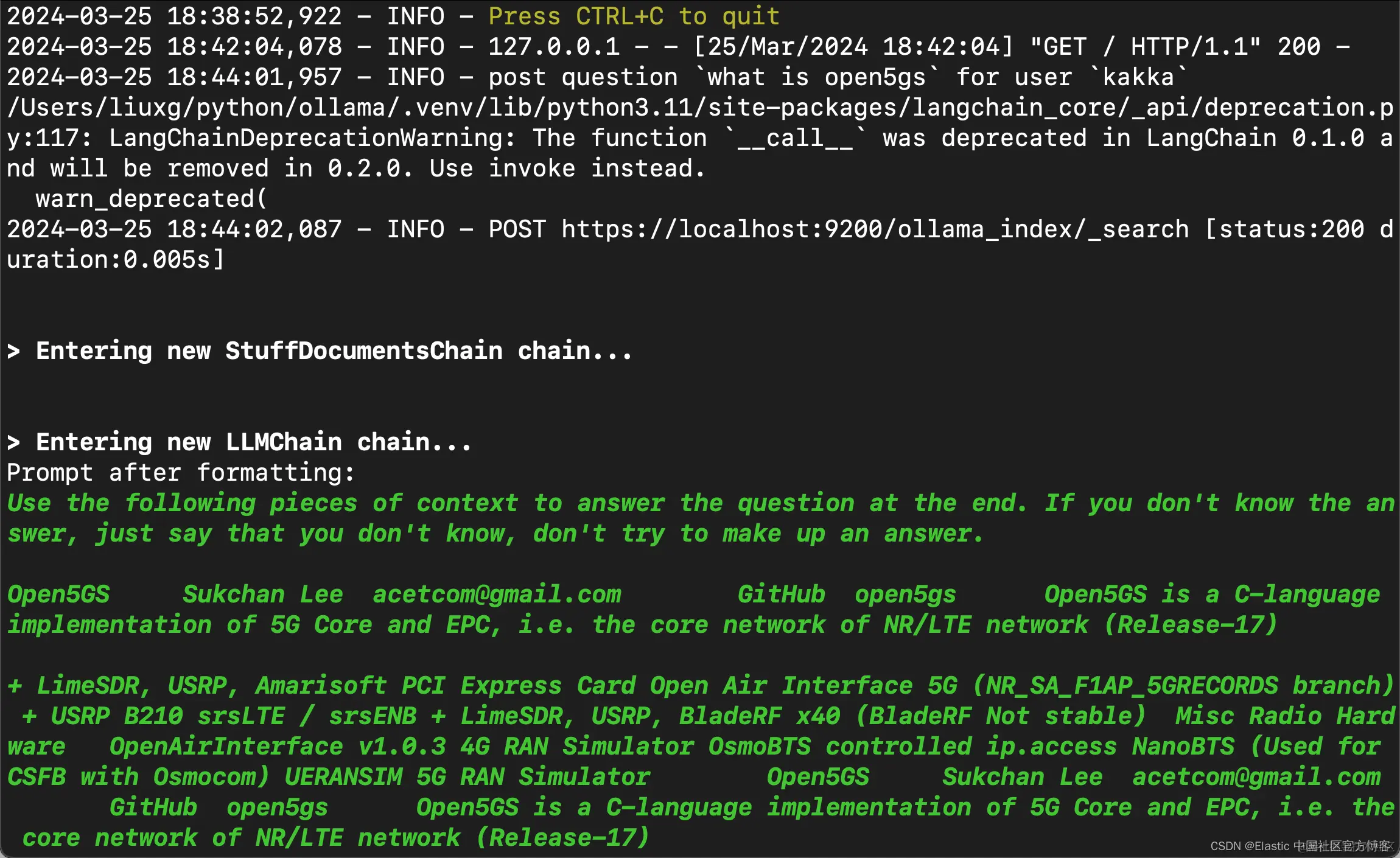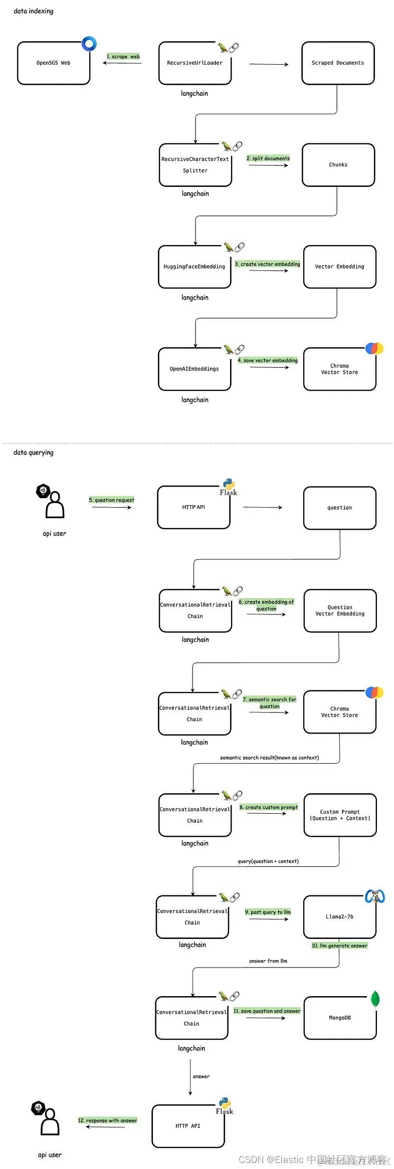 该 RAG 应用程序包含一个定制的数据集,该数据集是从在线网站动态抓取的。 用户可以通过 API(例如 REST API)与网站数据进行交互。 出于演示目的,我们选择了 Open5GS 文档网站(Open5GS 是 5G Core 的 C 语言实现)。 Open5GS 文档中的数据被抓取、分割,然后作为向量嵌入存储在 Elasticsearch 向量数据库中。 因此,用户可以通过 API 与 Open5GS 文档的内容无缝交互。