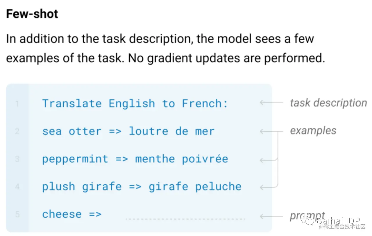 它是插入到输入示例中的一段文字,能够将原始任务(original task)表述为语言模型问题 (language modeling problem)。例如,假如我们要对下面这条电影评论“不值得看(No reason to watch)”进行分类,我们可以将prompt“It was”插入到句子中,得到“No reason to watch. It was ____”。很自然的,语言模型产生“terrible(可怕)”的概率比“great(伟大)”的概率高。本文会介绍大型语言模型中prompt的最新进展。