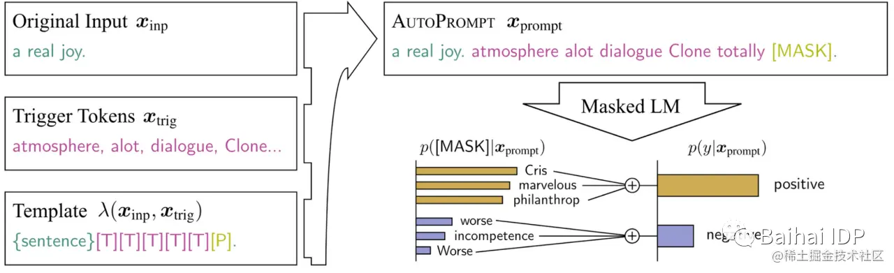 AutoPrompt(Shin et al., 2020)[17]提议采取基于梯度的搜索(该想法来自Wallace et al., 2019[18],旨在搜索一个通用的对抗性触发器,使模型产生特定的预测),为特定任务找出最佳prompt。AutoPrompt的设置是不同的,因为它固定了模型:它假设所有的东西都被编码在预训练的模型中,我们需要的只是”prompt”出来;另一个原因是,AutoPrompt的目标也是LAMA(LAnguage Model Analysis)(Petroni et al., 2019[19]),这是一种知识探测任务,它被要求不触及模型参数。