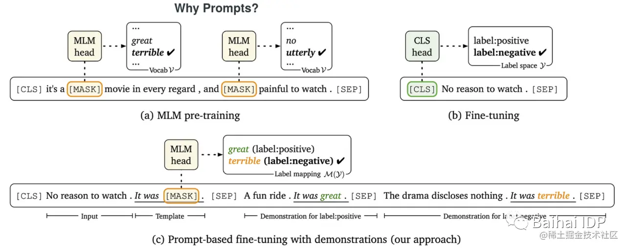 以情感分类任务为例,对预训练、标准的微调和基于提示的微调进行了说明(from Gao et al., 2021)