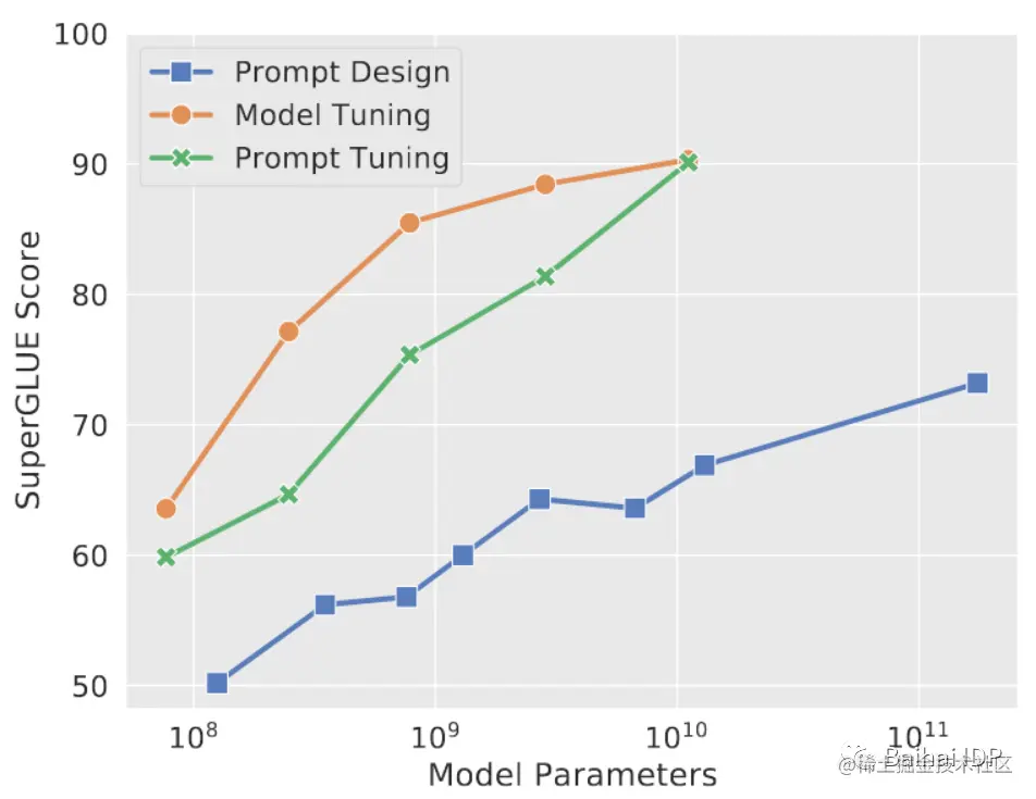 另外,正如Lester等人(2021)[25]所证明的,在使用超过100亿个参数的预训练模型之前,soft prompts从未在SuperGLUE上实现与全微调相同的性能。我认为未来值得研究的是如何进一步推动soft prompts在极端情况和较小的语言模型中更有效地工作。