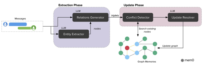 在Extraction 和 Update阶段,Mem0架构由LLM将Message,或者说Raw Memories处理为“实体”和“关系”。并且在Update阶段,会通过冲突检测和解决机制将New Memories整合到现有的知识图谱。