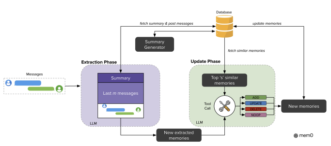 这张图来自于Mem0团队发布的论文,主要对Mem0的核心实现逻辑进行了说明,这里我们对它进行拆解: