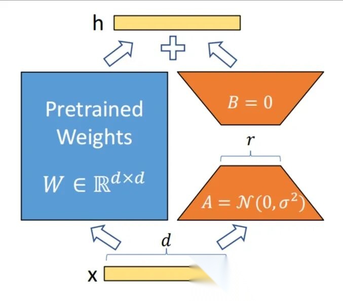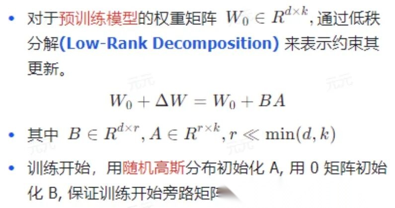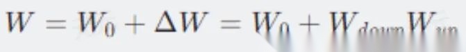 以LoRA为例,其通过将自注意力模块的权重变化分解为两个低秩矩阵的乘积实现参数压缩,即: