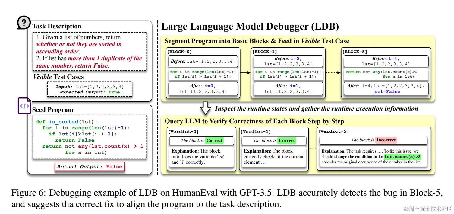 LDB 系统的工作原理是将 LLM 生成的代码作为输入,并通过解释器逐行执行。对于每一行,LDB 都会检查代码的运行时执行是否与预期行为一致。如果不一致,LDB 会将该行标记为潜在错误,并向开发人员提供有关该问题的详细信息。