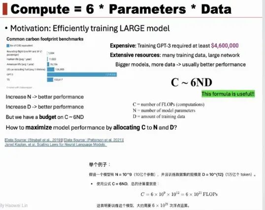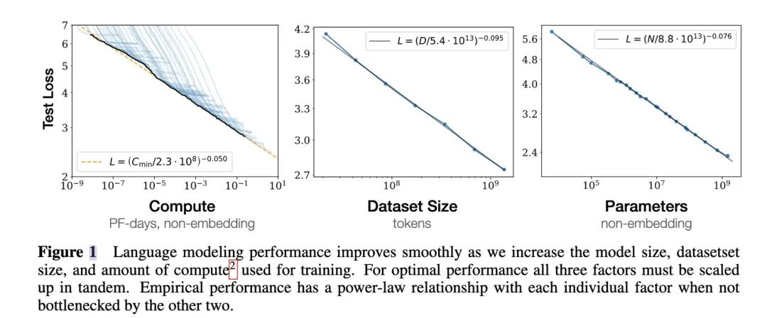 计算量C,模型参数量N ,数据大小D,当不受其它两个因素制约时,模型性能与每个因素均呈幂等关系,三者满足