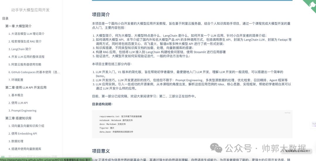 但是! “llm-universe” 项目,绝对是 一股清流! 它就像一位 超级耐心的老司机,手把手教你从零开始, 用最接地气的方式,带你玩转大模型应用开发! (温馨提示:这个项目是 Datawhale 团队出品的,我个人也是在学习使用,觉得非常棒,所以来给大家强烈推荐!)