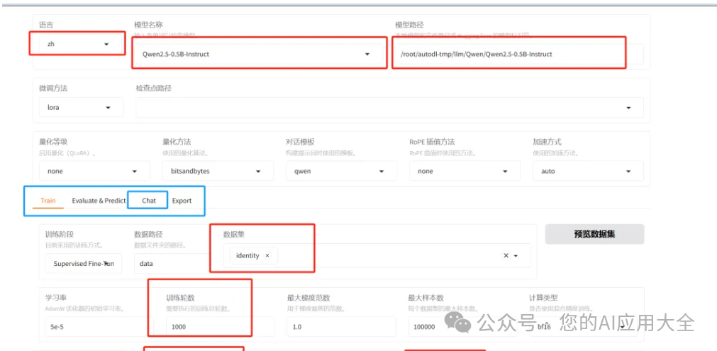 - 中间的4个任务:train训练,Evalate@predict 测试 ,Chat对话,Export 模型导出。