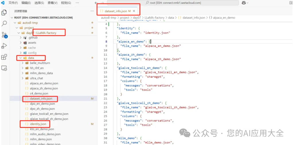 LLaMA Factory的源码里默认提供了很多种可直接训练的数据集,在data目录下。我们就拿identity.json身份认知训练集来做微调,将里面的占位符替换成合适的文字,并且保存。