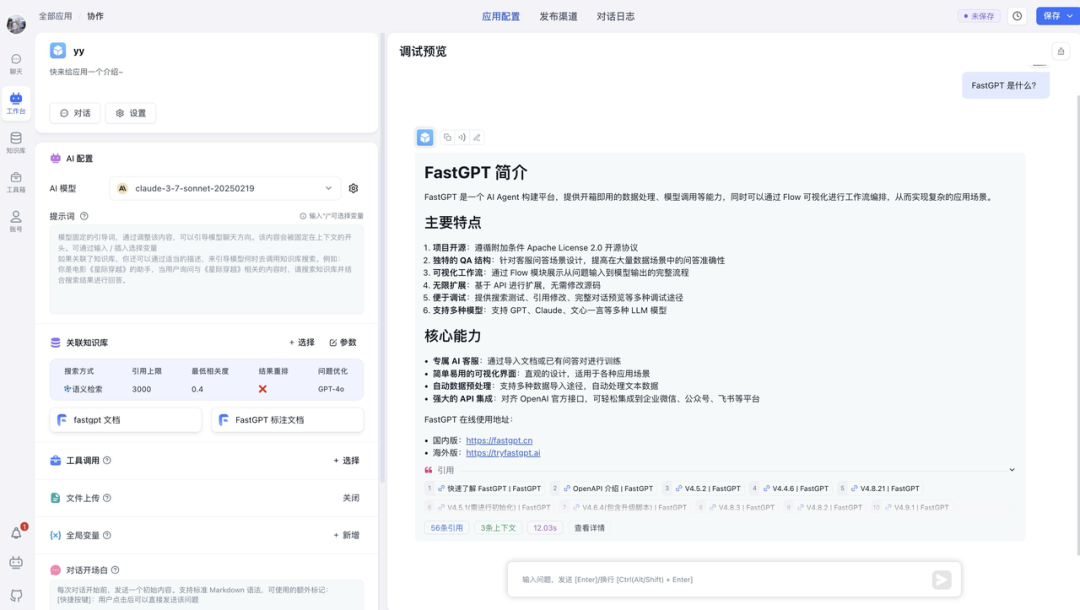 在应用调试与运营层面,FastGPT 提供了完整的调用链路日志、节点日志、知识库搜索测试与对话引用反馈功能,帮助用户精确定位问题并优化系统表现。平台支持免登录分享与 Iframe 一键嵌入,便于企业快速集成;同时具备应用日志与数据标注功能,支持持续的性能评估与内容优化。