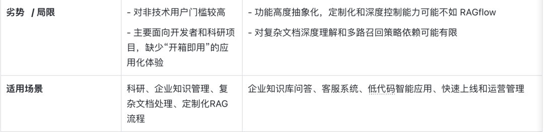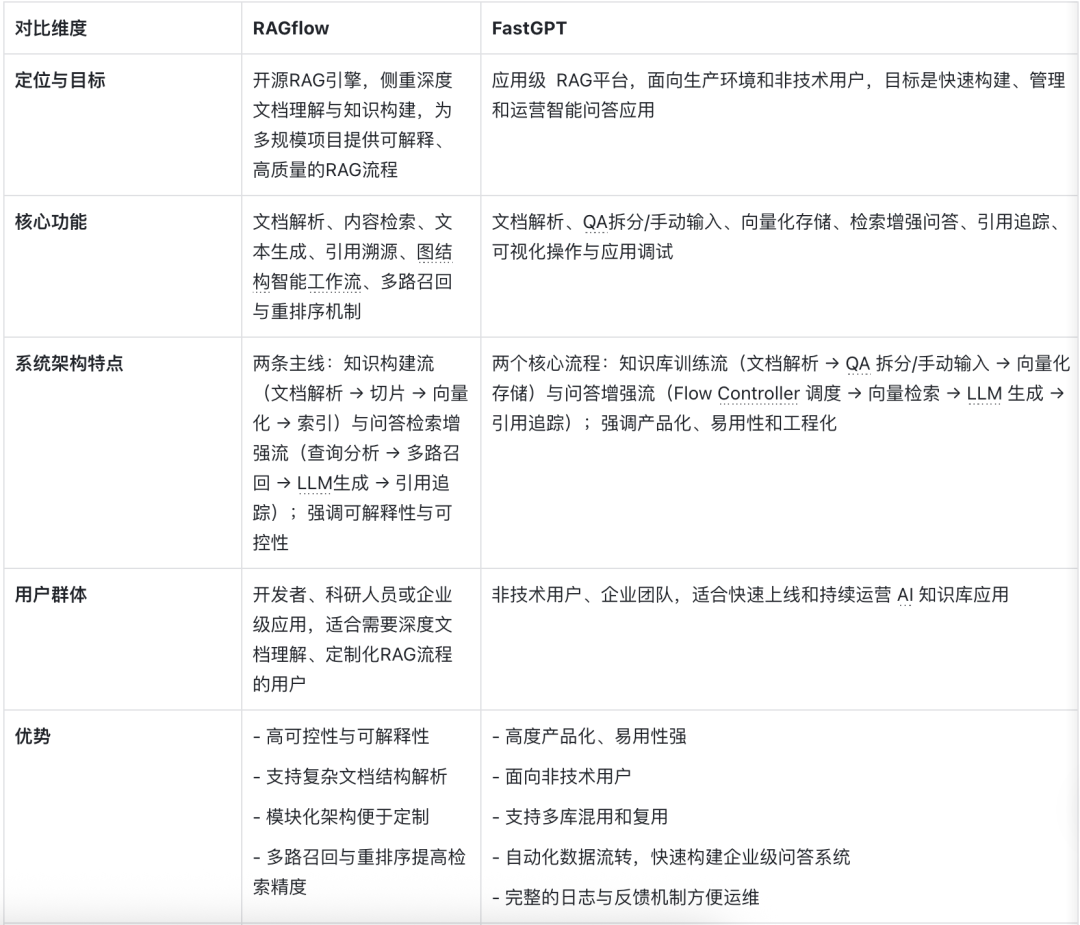 总体来看,RAGflow和FastGPT分别代表了RAG技术的两个应用方向:前者偏向科研与技术驱动,适合对精度和可控性要求高的场景;后者偏向产品化与业务落地,适合希望快速上线和可持续运营的企业应用。两者都通过向量检索和大语言模型的结合,实现从知识获取、索引构建到智能问答的完整闭环,但在用户群体、操作体验和功能侧重点上呈现互补关系。