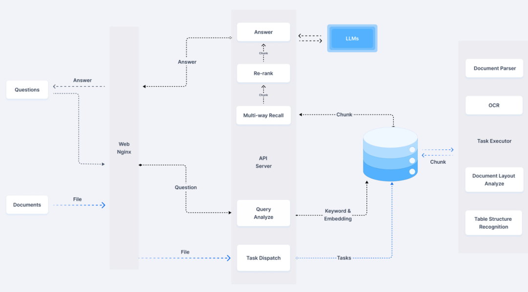 RAGFlow 的系统架构由两条主线构成:知识构建流与问答检索增强流,共同形成从数据理解到智能问答的完整闭环。