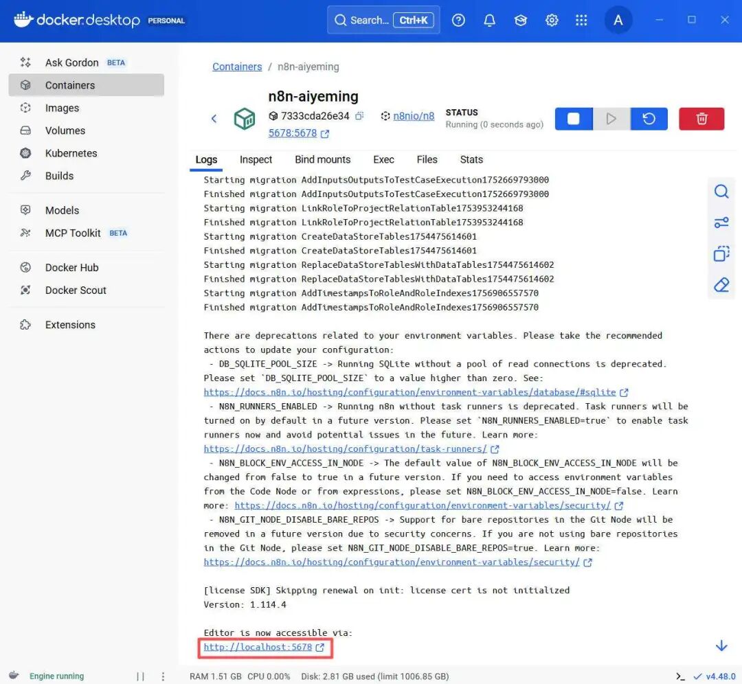 点击“Run”后如下图所示,则说明n8n部署完毕。