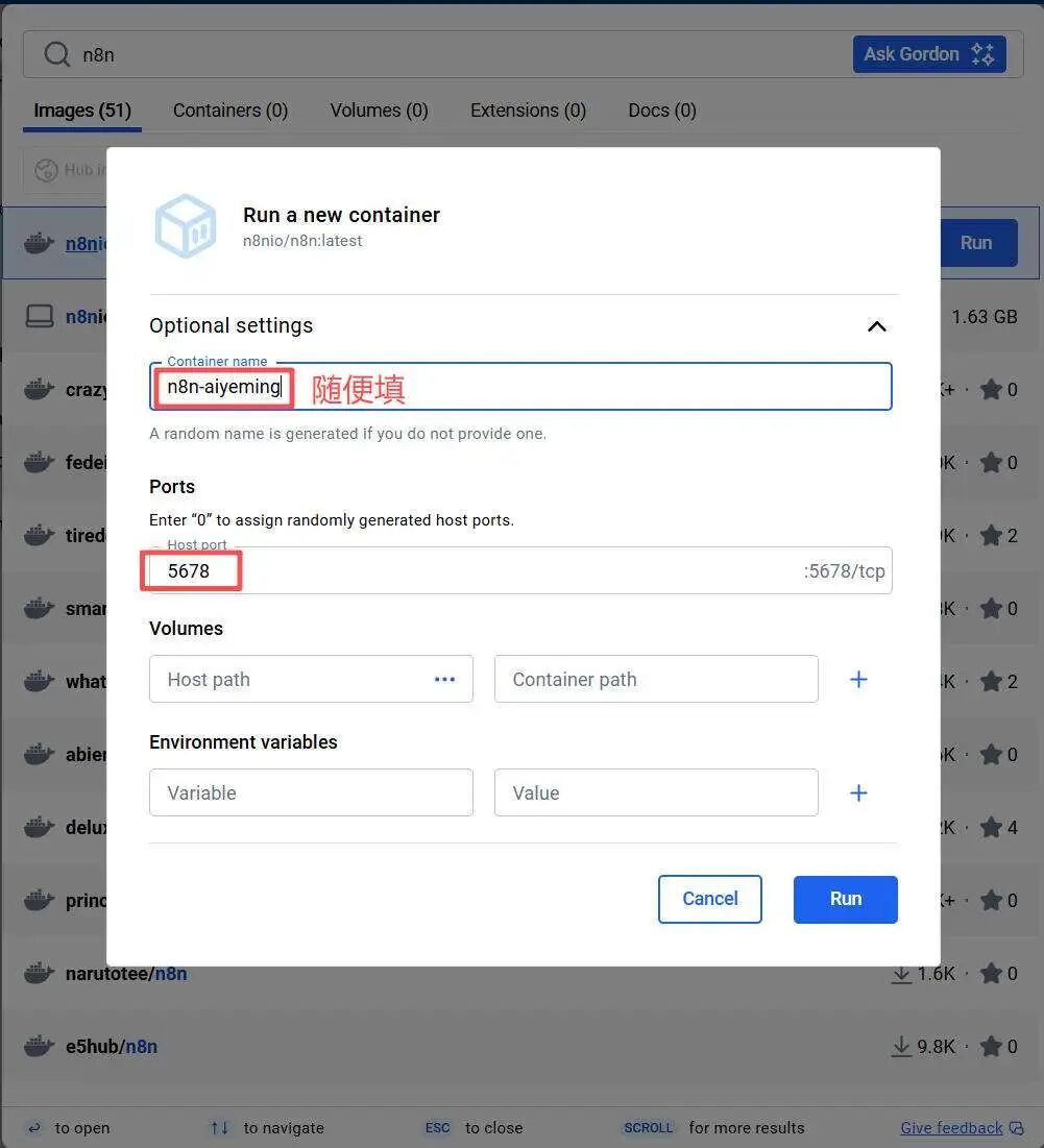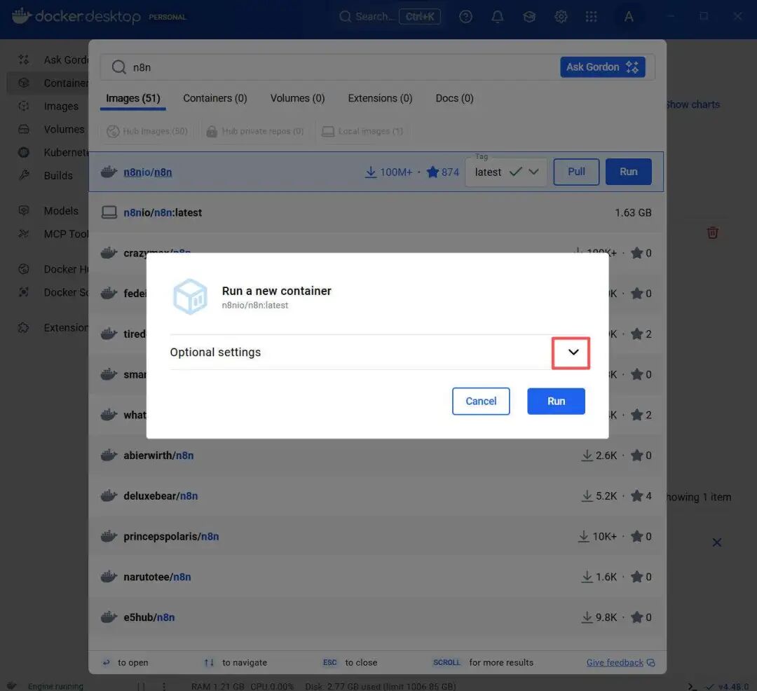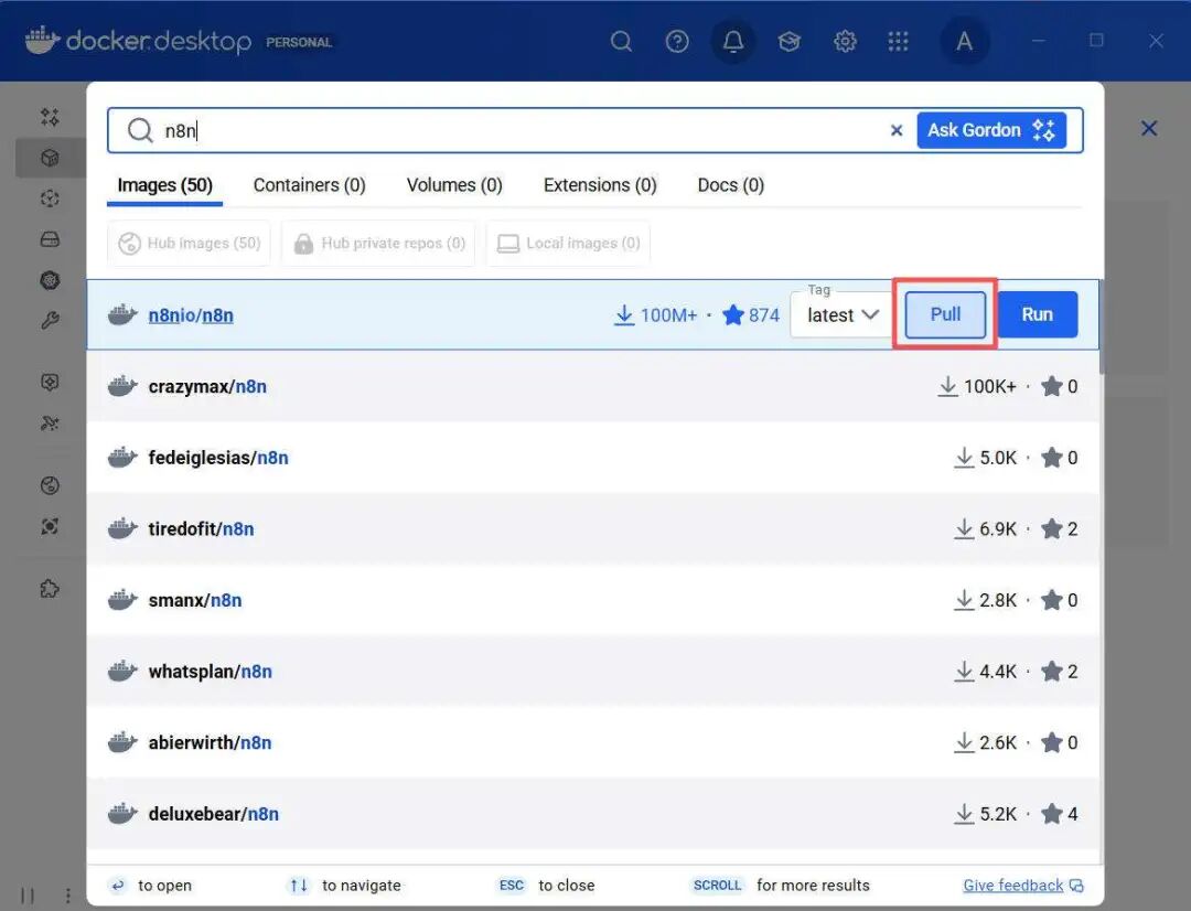 Docker安装完毕后,进入Docker主界面,搜索框内搜索“n8n”,选取第一个,并点击“Pull”按钮;
