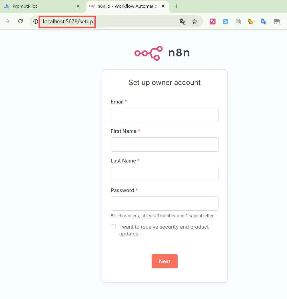 浏览器访问 http://localhost:5678,按提示设置邮箱与密码(本地使用不需要验证);