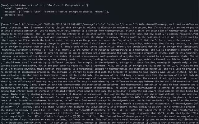 ollama serveQwen3 在后台运行时,您可以使用 HTTP API 以编程方式与 Qwen3 进行交互,这非常适合后端集成、自动化或测试 REST 客户端。