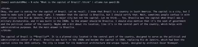 subprocess.run()方法运行命令ollama run qwen3:8b,并将提示符作为标准输入。 - 最后,将输出(来自 Qwen3 的响应)捕获并以解码字符串的形式返回。