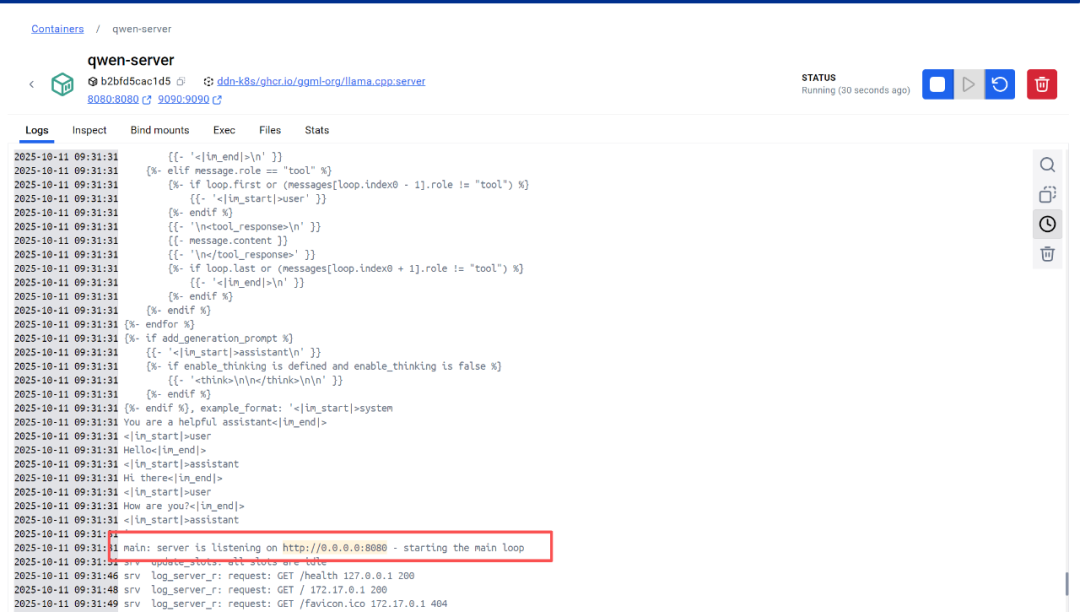 docker run -itd --name qwen-server -p 8080:8080 -v D:/model/Qwen3-0.6B-GGUF:/opt swr.cn-north-4.myhuaweicloud.com/ddn-k8s/ghcr.io/ggml-org/llama.cpp:server --model /opt/Qwen3-0.6B-BF16.gguf --host 0.0.0.0 --port 8080 --ctx-size 2048 --threads 8 --batch-size 512