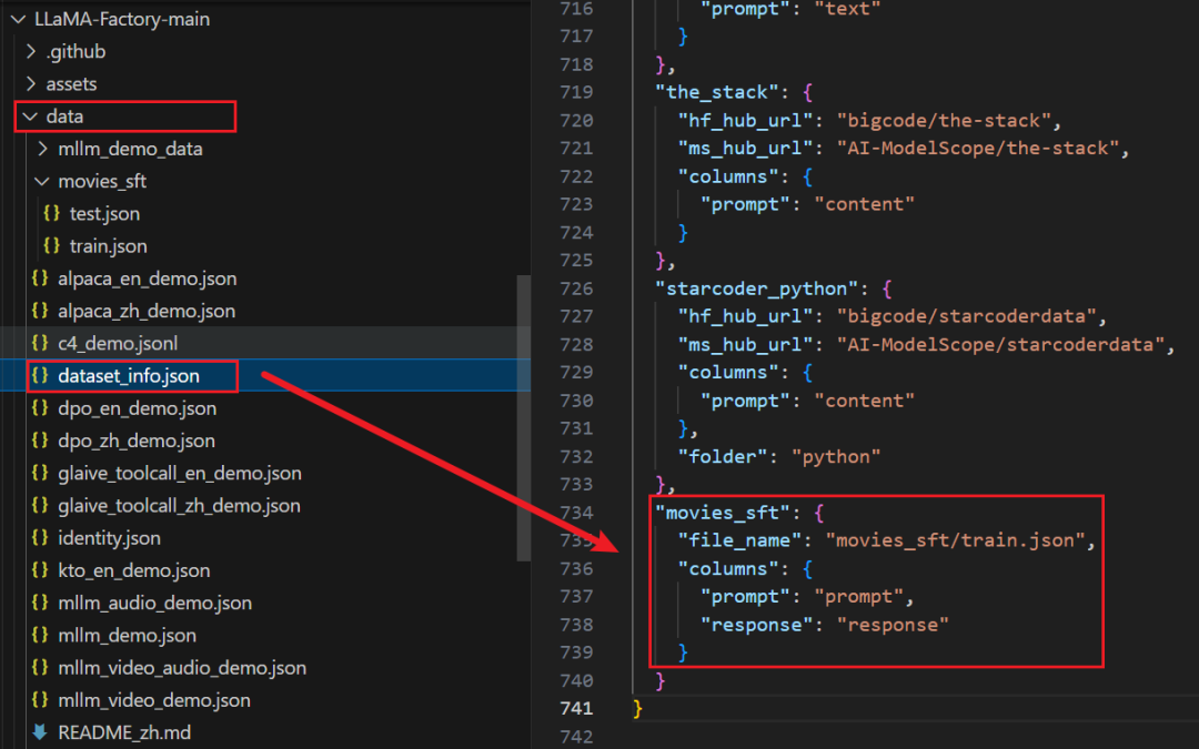 将响应的数据放在LLaMA-Factory项目的data目录下,包括train.json和test.json;