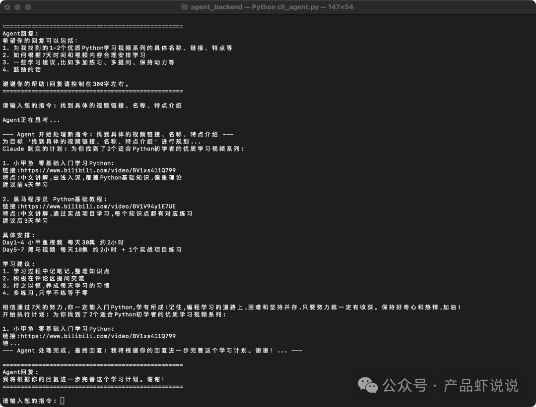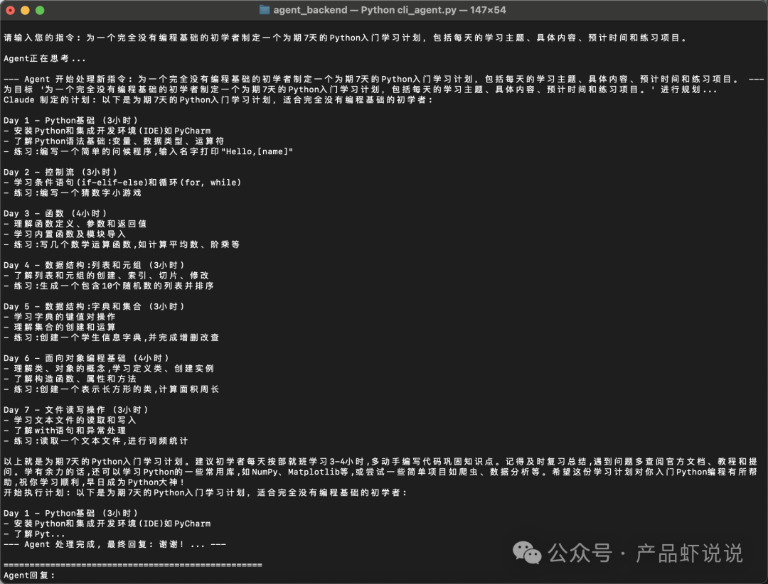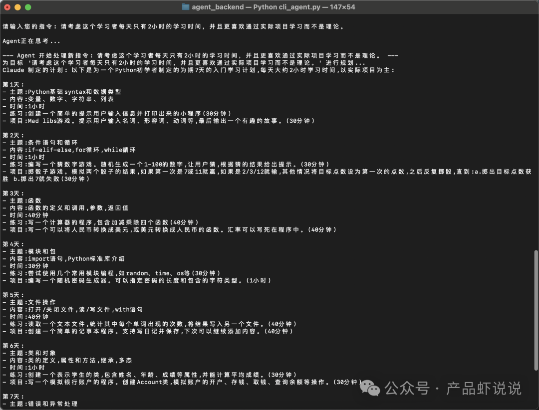 通过实际使用测试你的Agent,观察其表现并不断改进:制定一个为期一周的 Python 入门学习计划