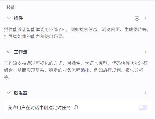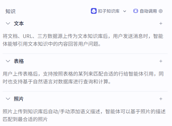 Coze/扣子平台提供了丰富的技能和知识库,可以根据需求添加到你的智能体中。