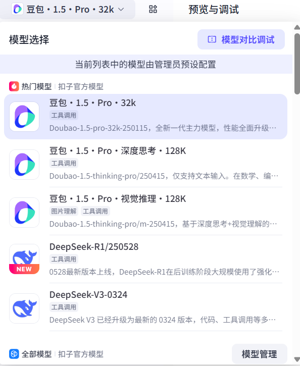 Coze/扣子平台支持多种大模型,如智谱AI、智谱GLM-4等。根据你的需求选择合适的模型。