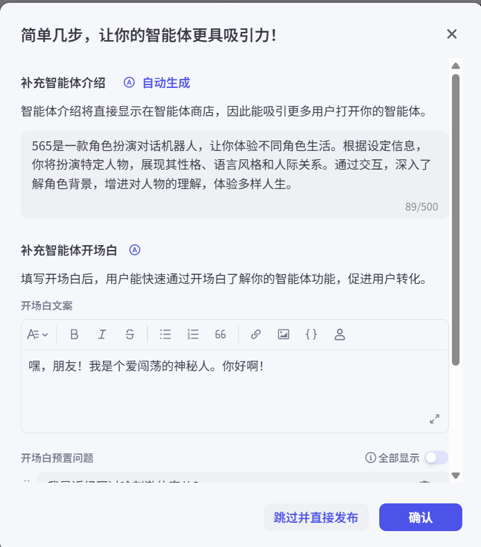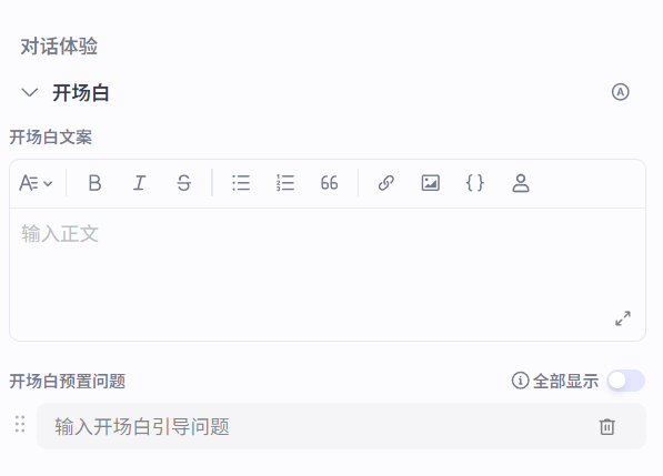 为了使智能体更加友好和人性化,可以设置开场白和结束语。