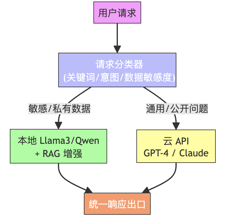 对于多数企业,“敏感数据走本地,通用问题走云” 是最优解。下图展示了典型的混合推理流程: