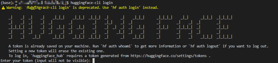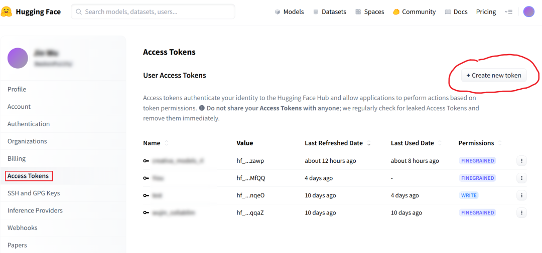 需要大家先登录HuggingFace官网,在Access Token子功能下创建一个自己的token,再输入到终端即可。