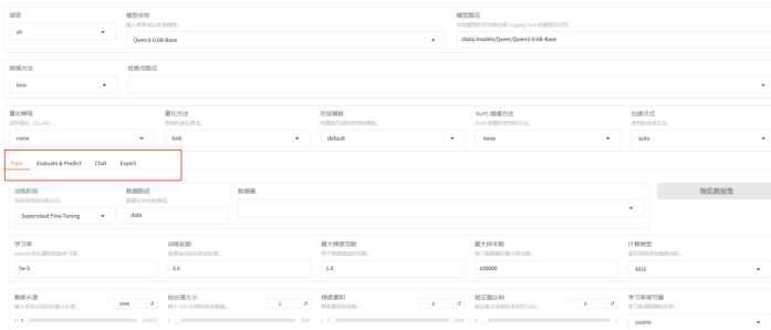 cd /data/train/LLaMA-Factoryexport GRADIO_SERVER_PORT=8800nohup llamafactory-cli webui 2>&1 > webui.log &