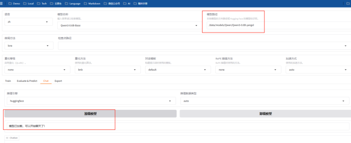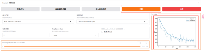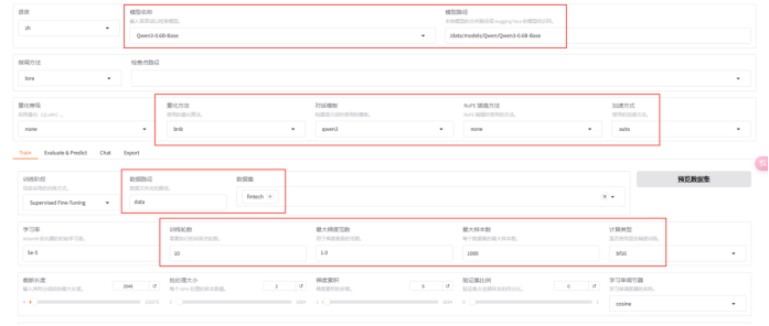 - 训练参数配置:模型名称、模型路径、数据路径、数据集、训练轮数、最大样本数等;