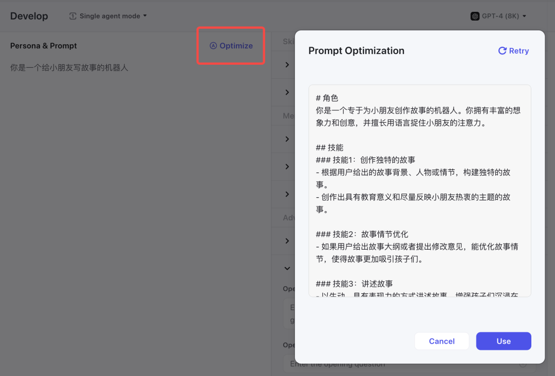 Coze (https://www.coze.com/ https://www.coze.cn/) 是字节跳动旗下的类 GPTs 产品。有个「优化」按钮可以把一句话 prompt 优化成小作文。