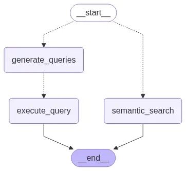 def build_research_graph(): builder = StateGraph(ResearcherState) builder.add_node(generate_queries) builder.add_node(execute_query) builder.add_node(semantic_search) builder.add_conditional_edges( START, route_step, {"generate_queries": "generate_queries", "semantic_search": "semantic_search"}, ) builder.add_conditional_edges( "generate_queries", query_in_parallel, # type: ignore path_map=["execute_query"], ) builder.add_edge("execute_query", END) builder.add_edge("semantic_search", END) return builder.compile()research_graph = build_research_graph()