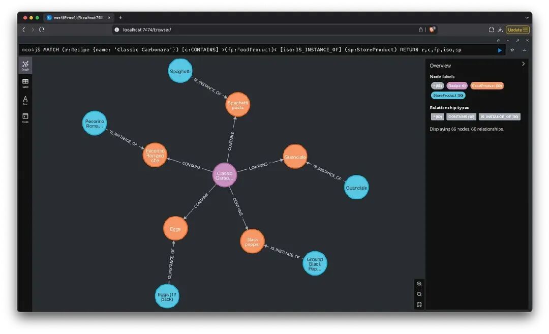 - semantic_search:通过在 Recipe 节点的‘name’属性上进行语义搜索,查找名称类似于‘pasta alla carbonara’的 Recipe 节点。