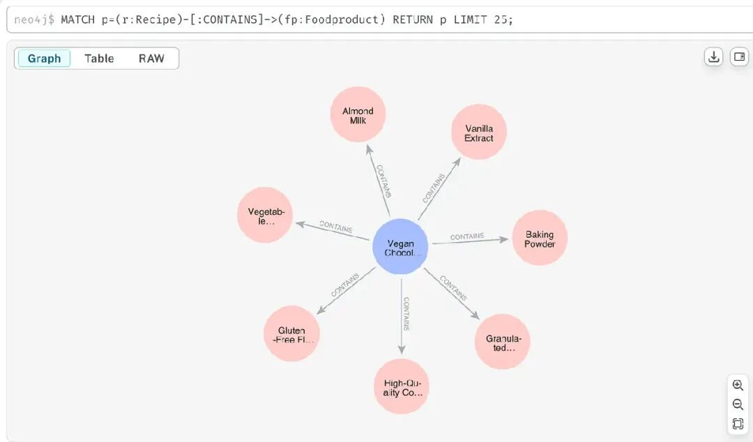 import openaifrom neo4j import GraphDatabasedriver = GraphDatabase.driver("bolt://localhost:7687", auth=("neo4j", "password"))recipe_id = "Vegan Chocolate Cake Recipe"recipe_embedding = openai.embeddings.create(model="text-embedding-3-small", input=recipe_id).data[0].embeddingwith driver.session() as session:# 创建嵌入字段 session.run( "MATCH (r:Recipe {id: $recipe_id}) SET r.embedding = $embedding", recipe_id=recipe_id, embedding=recipe_embedding )# 创建向量索引 session.run( "CREATE VECTOR INDEX recipe_index IF NOT EXISTS FOR (r:Recipe) ON (r.embedding) OPTIONS {indexConfig: {`vector.dimensions`: 1536, `vector.similarity_function`: 'cosine'}}" )