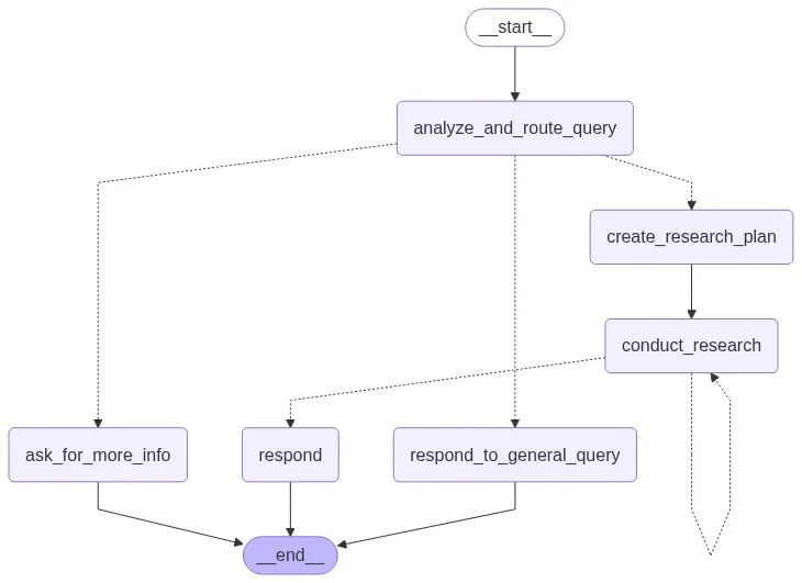 def build_main_graph(): builder = StateGraph(AgentState, input=InputState) builder.add_node(analyze_and_route_query) builder.add_node(ask_for_more_info) builder.add_node(respond_to_general_query) builder.add_node(create_research_plan) builder.add_node(conduct_research) builder.add_node("respond", respond) builder.add_edge("create_research_plan", "conduct_research") builder.add_edge(START, "analyze_and_route_query") builder.add_conditional_edges("analyze_and_route_query", route_query) builder.add_conditional_edges("conduct_research", check_finished) builder.add_edge("respond", END) return builder.compile()