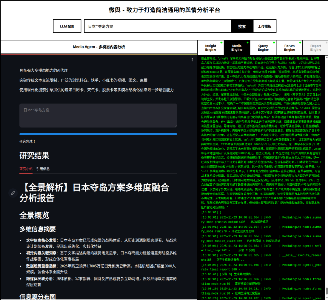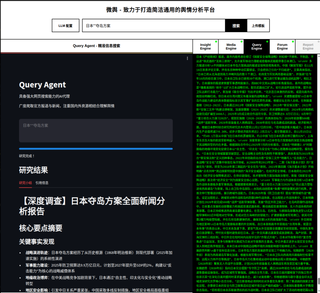 启动 Streamlit 界面,输入 “日本‘夺岛方案’”。接下来的几分钟,是一场 AI Agent 协同工作的暴力美学展示。